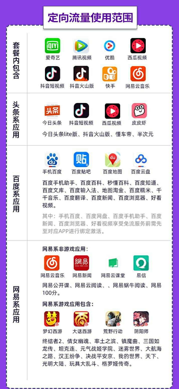 买卡之前还要分清楚定向流量和通用流量的区别。通用流量就是不限制APP的,流量是通用。定向流量就是特定的APP免流,需要看自己经常用哪几个APP,就办哪个卡。